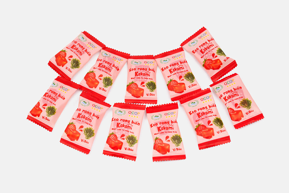 Kẹo rong biển Kakami là dòng sản phẩm sáng tạo của Sơn Hải, kết hợp tinh túy từ rong biển tự nhiên và hương vị dâu tây ngọt ngào.