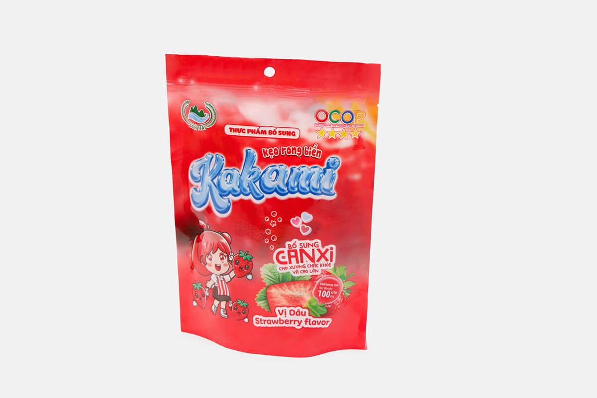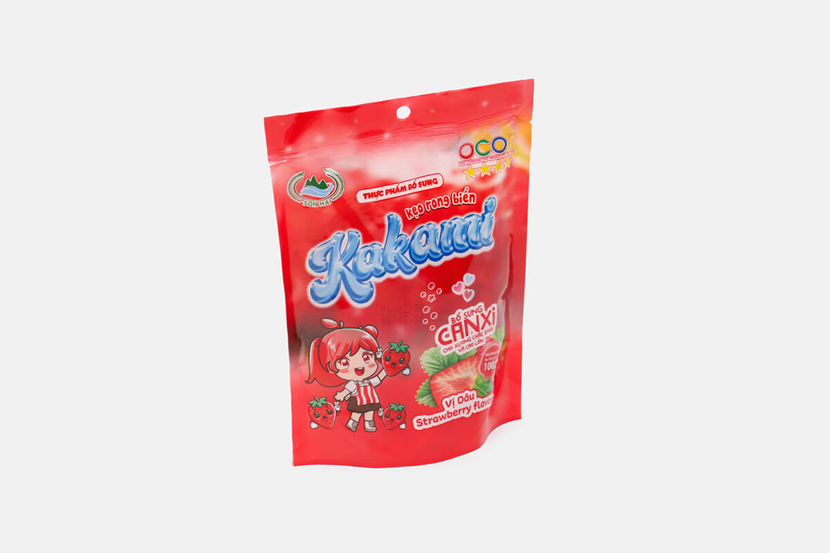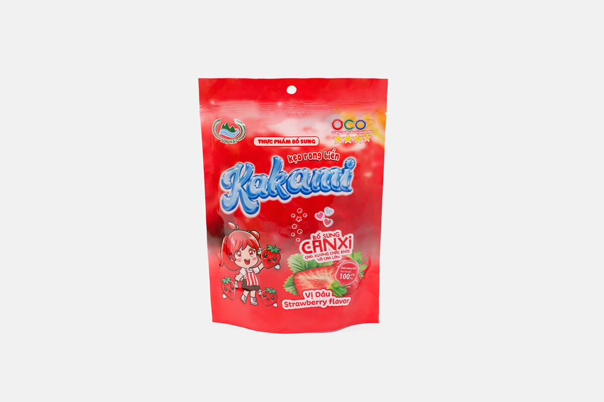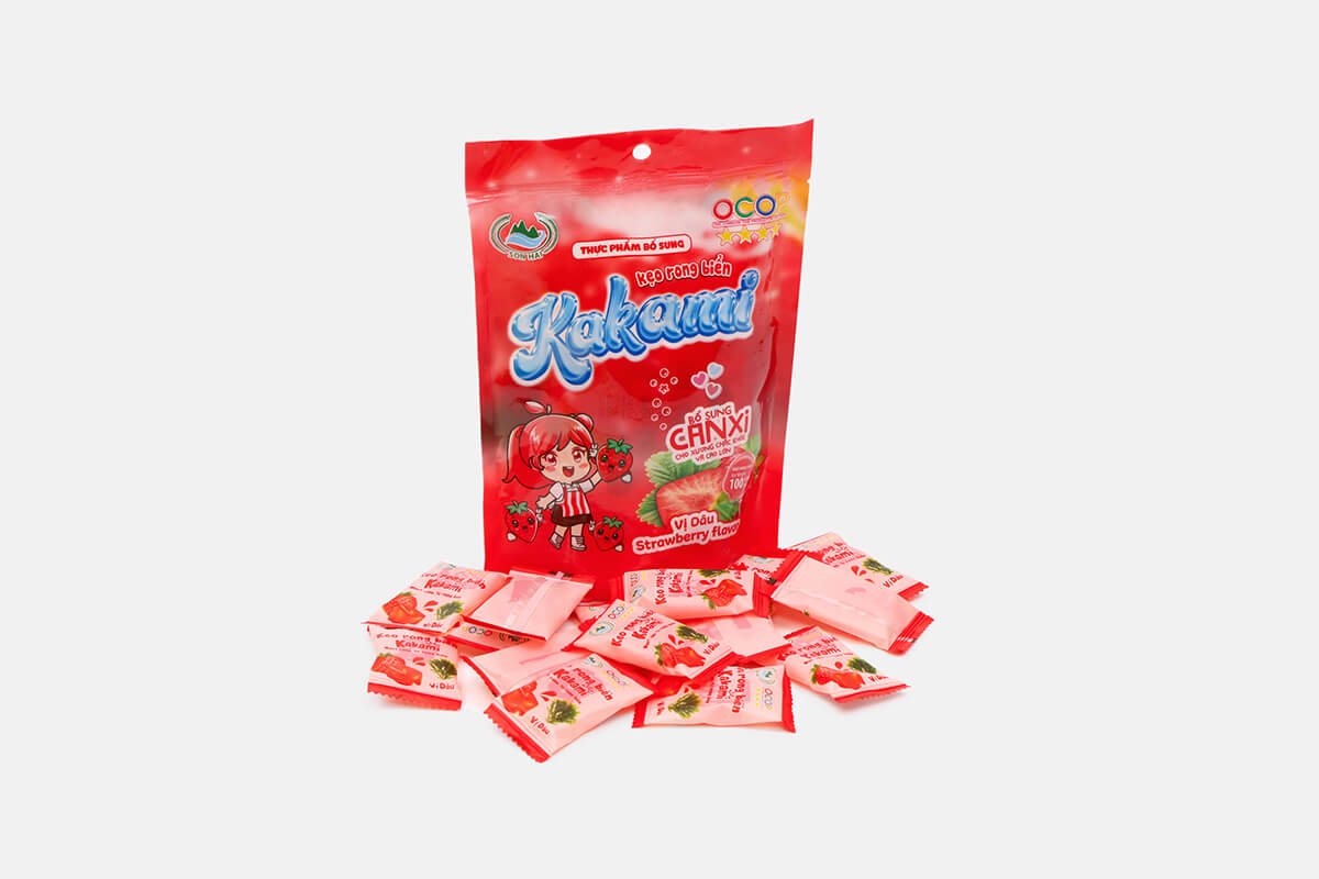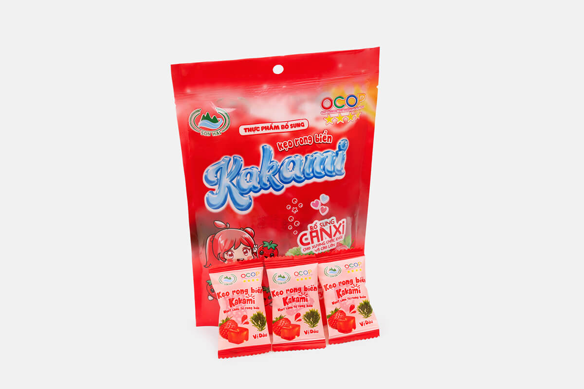 Kẹo rong biển Kakami là dòng sản phẩm sáng tạo của Sơn Hải, kết hợp tinh túy từ rong biển tự nhiên và hương vị dâu tây ngọt ngào.