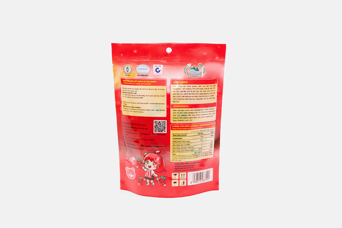 - Hương dâu tổng hợp và màu thực phẩm cho phép.
